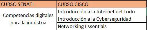 Y para los jóvenes que lleven el curso de «Competencias digitales para la industria» en senati, en Cisco llevarán todos estos cursos: